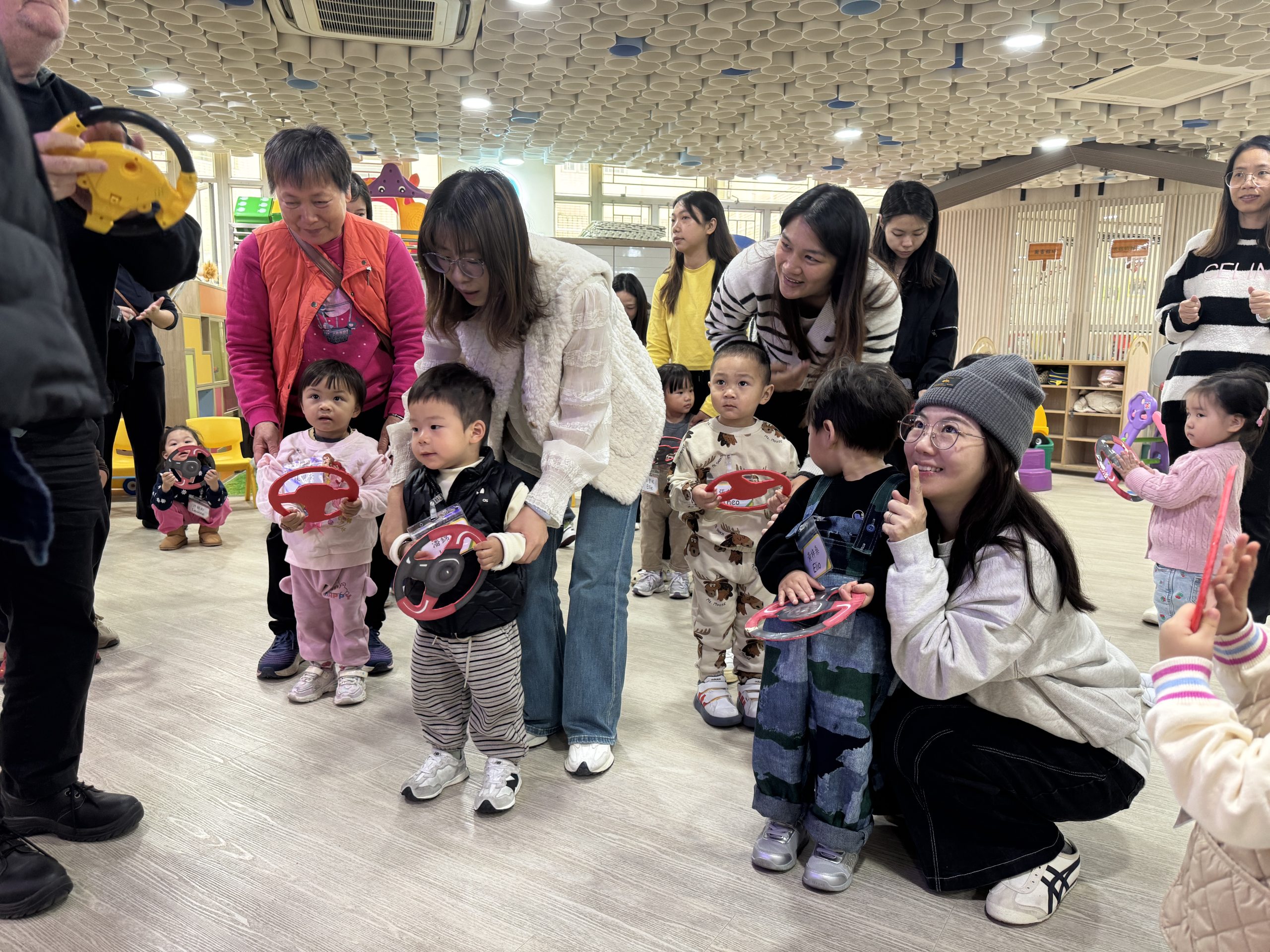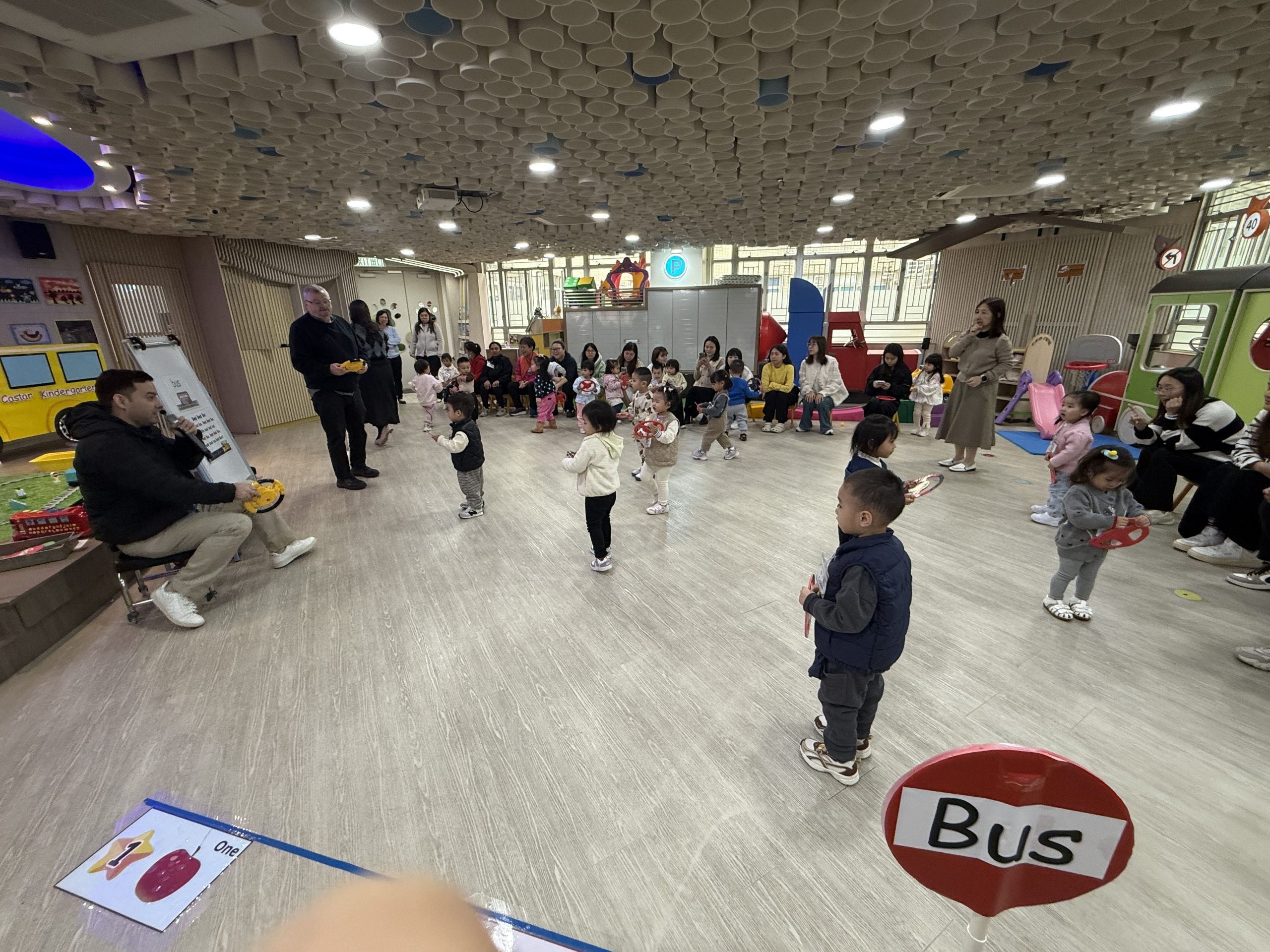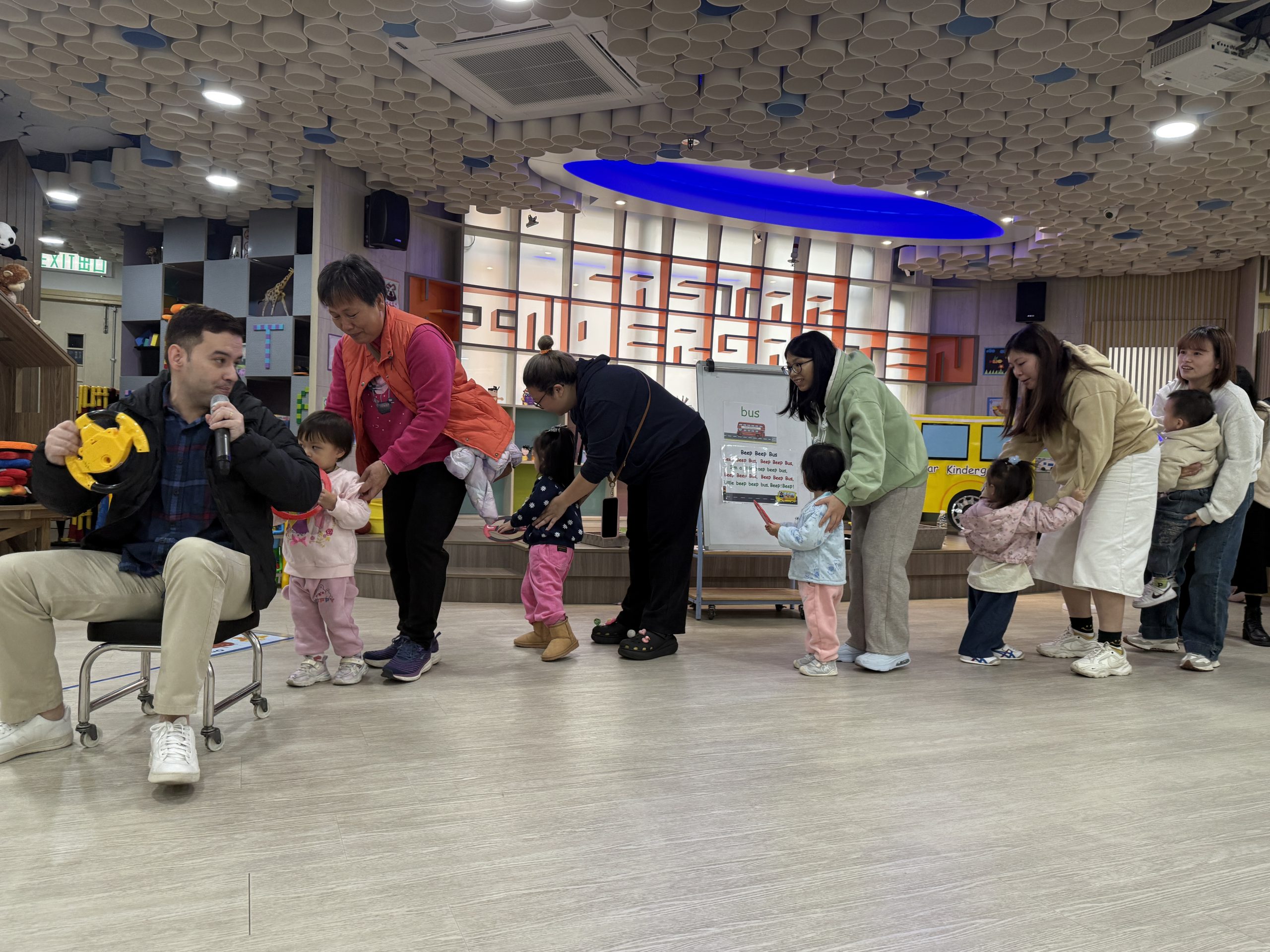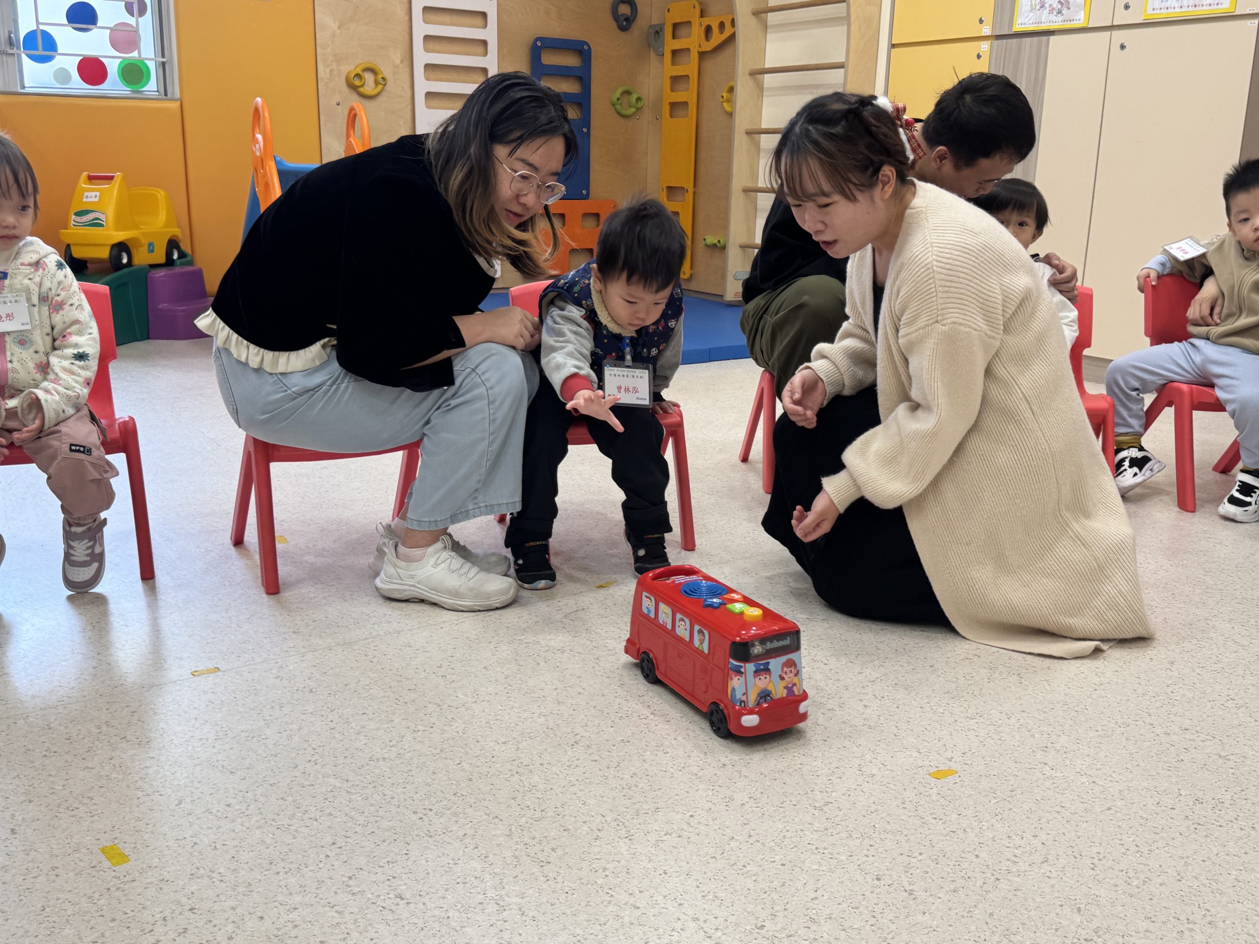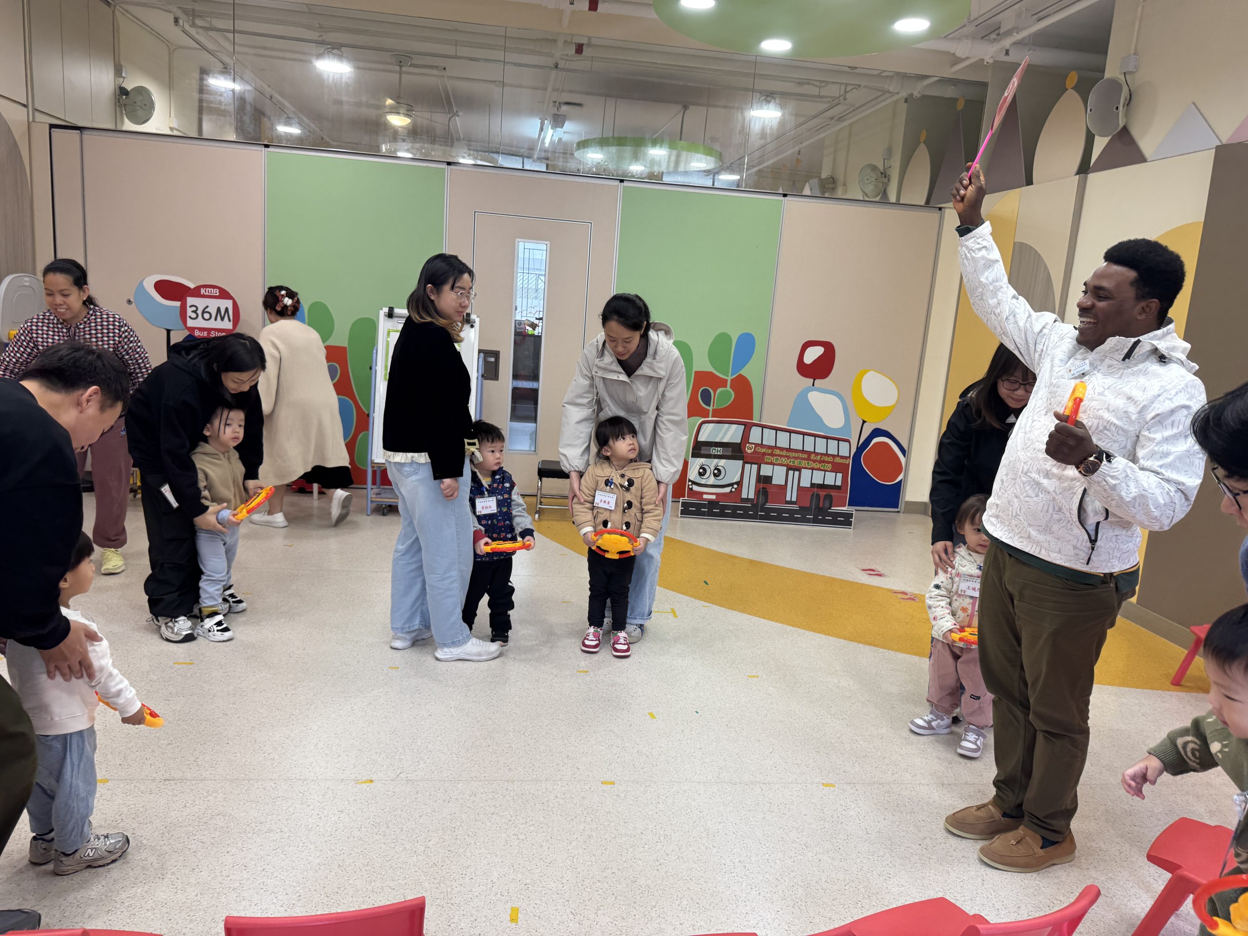 12 12 月, 2025 新生英文遊戲班(1) (new) 我們為新生家長及小朋友舉行了「新生英文遊戲班」!小朋友進入活動區就已被色彩繽紛的「紅色巴士」吸引了眼球!在外籍老師生動活潑的帶領下,大家一起唱著經典童謠《The Wheels on the Bus》,玩轉巴士方向盤、搖搖鈴、按喇叭,又跟老師用全英語互動,邊玩邊說,笑聲滿滿!活動中,小朋友看著可愛的巴士,大聲喊出「Bus!」,可愛極了!第一次來學校的小朋友,初時有些害羞,但不到半小時就跟外籍老師玩得超熟絡,家長們也直說:「原來孩子這麼快就能開口說英語!」