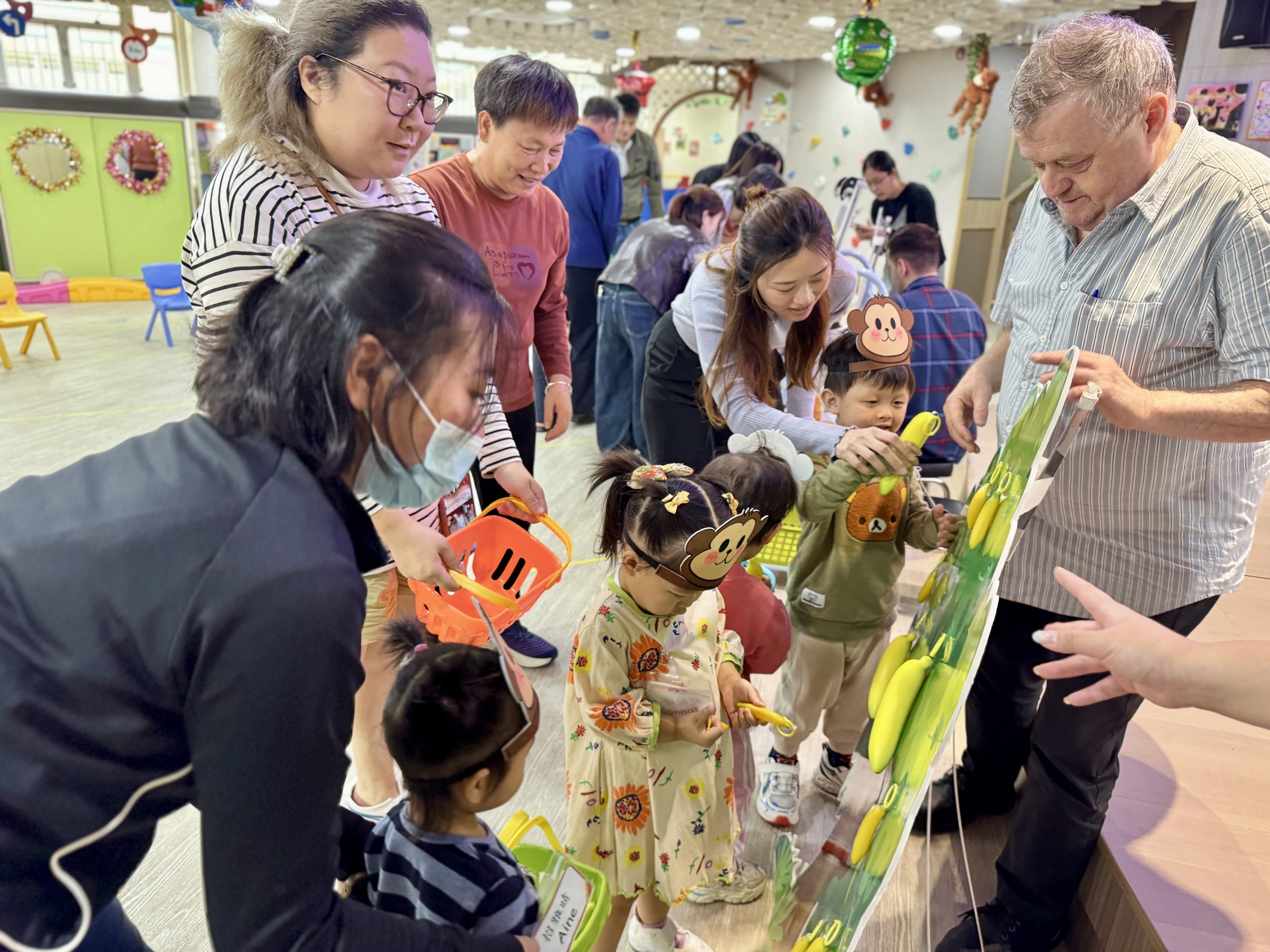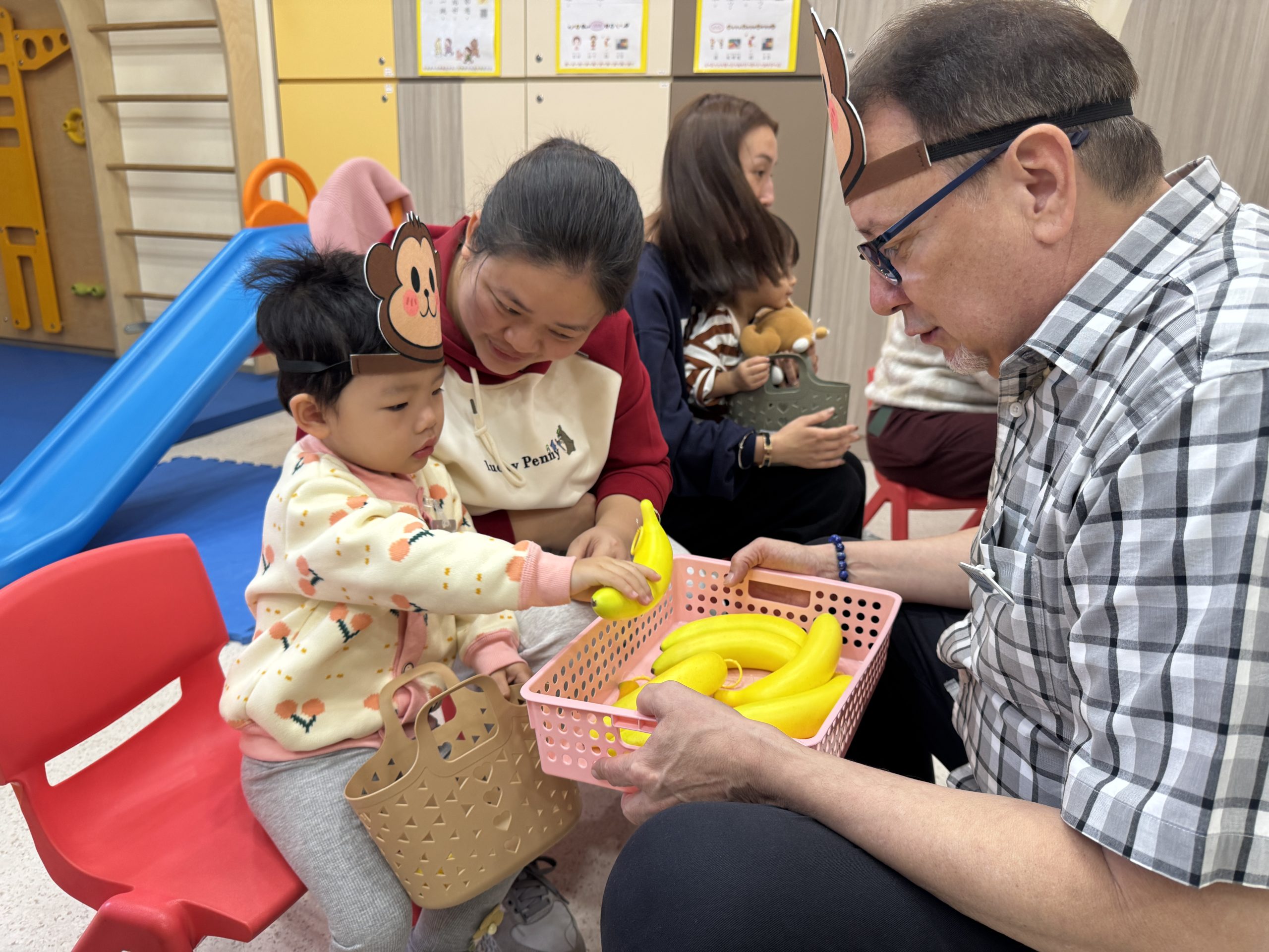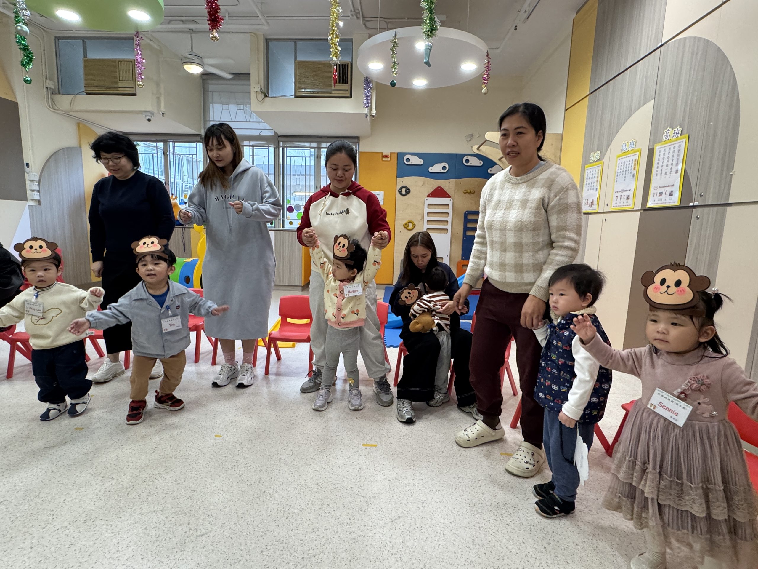 21 12 月, 2025 新生英文遊戲班(2) (new) 活動回顧﹕親子英文遊戲班(2) 「Little Monkey , Little Monkey ….」是次「新生英文遊戲班(2)」,一眾小朋友戴上猴子頭飾,變身成為可愛的小猴子,與外籍老師一同唱唱跳跳,邊玩邊學,非常開心! 樹上又大又小的香蕉,那一隻合適?聽著外藉老師的說話就成功做到了,還會說「Banana!」呢!看著小朋友們開心雀躍的樣子,可愛極了!